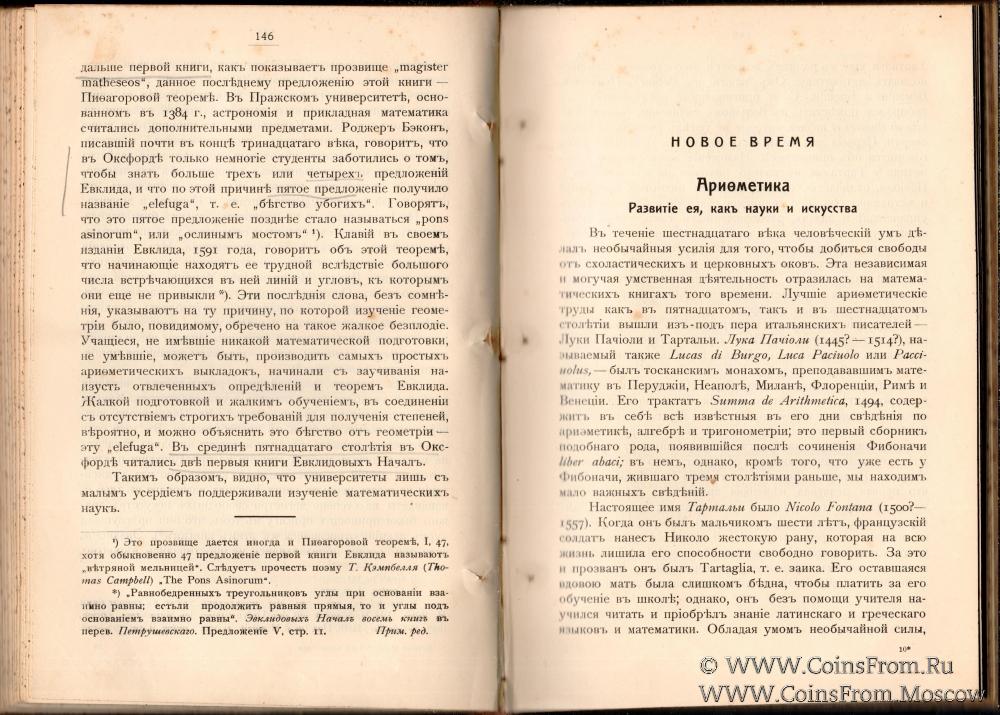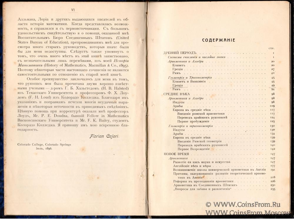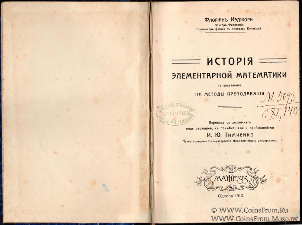 История элементарной математики с указаниями на методы преподавания. Флориан Кэджори Доктор Философии, Профессор физики в Колорадо Колледже. Перевод с английского под редакцией с примечаниями и прибавлениями И.Ю. Тимченко Приват-доцента Императорского Новороссийского университета. Одесса. 1910 г. 368 страниц.