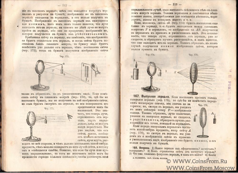 Начальные основания физики. Составил А. Малинин. Руководство для городских училищ и учительских семинарий. Издание двадцатое. Издание книжного магазина В.В. Думного под фирмой "Наследники бр. Салаевых". Типография Г. Лиссена и Д. Собко. Москва. Воздвиж. пер д.9 1912 г. 242 страницы.