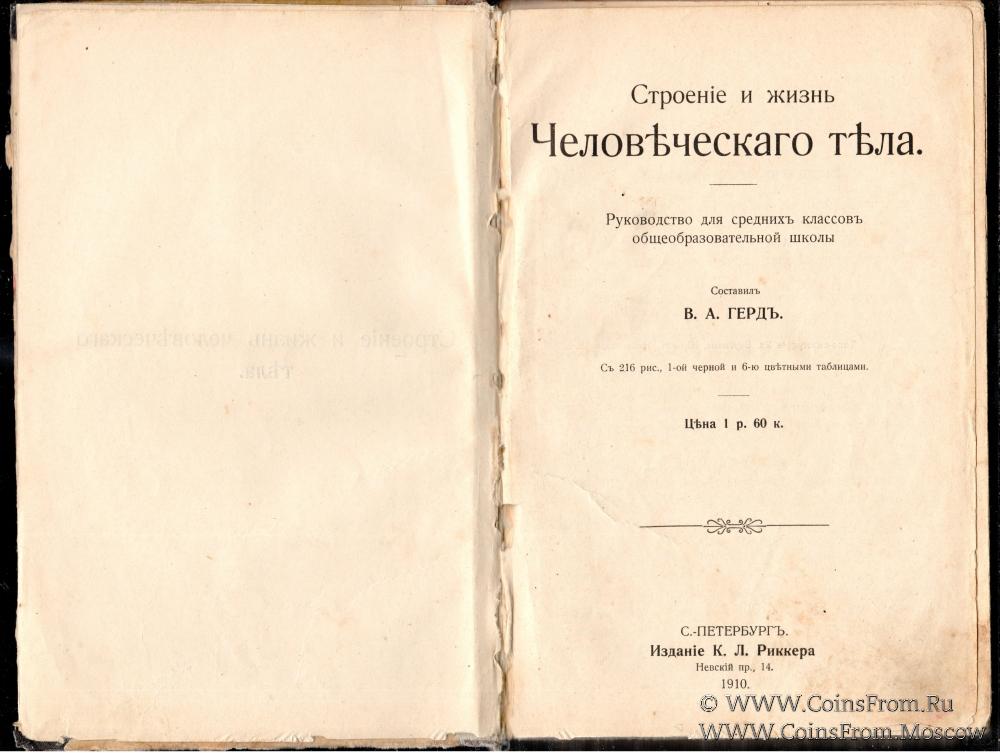 В.А. Герд. Строение и жизнь человеческого тела. 1910 г. Руководство для средних классов общеобразовательной школы. С.-Петербург. Издание К.Л. Риккера. Невский пр-т, 14. 224 страниц и приложения.