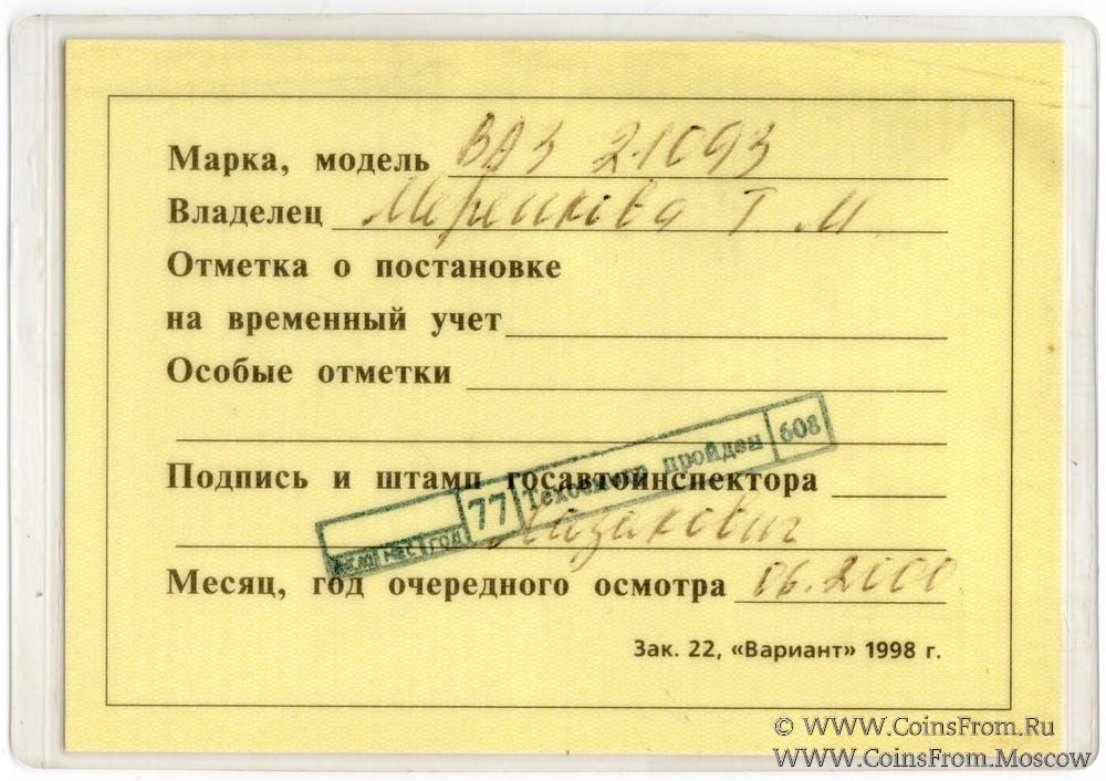 Талон технического осмотра 2000 г. Москва.