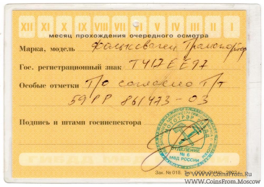 Талон технического осмотра 2003 г. Москва.