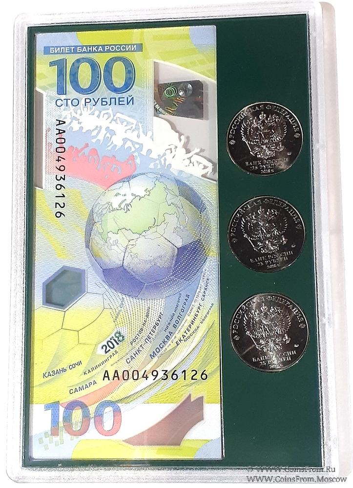 Набор, посвященный Чемпионату Мира по футболу в 2018 году в России, в пластиковом буклете с зелёной подложкой (вариант 2). Московский монетный двор (ММД).
