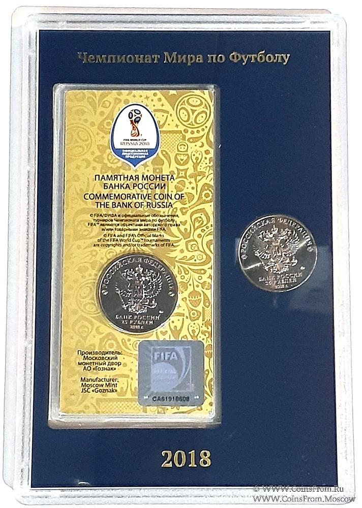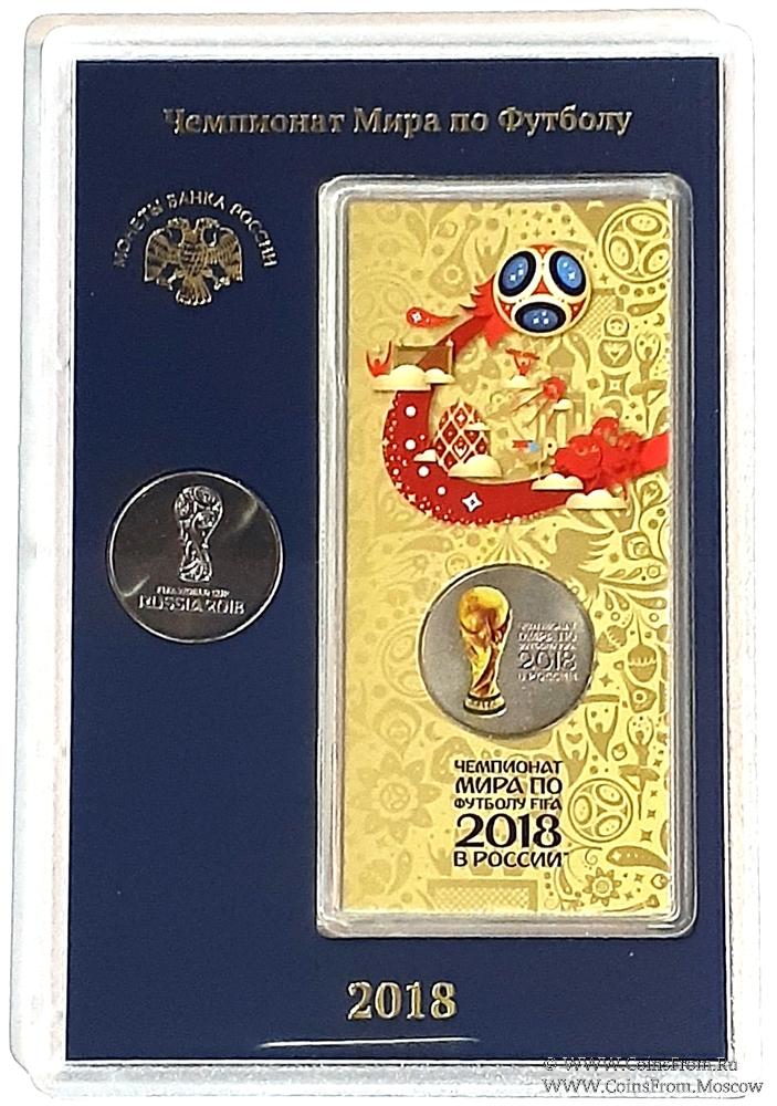 25 рублей 2018 г. (выпуск 2016 г.) - памятная монета из медно-никелевого сплава с выполненным на реверсе в цвете изображением Кубка Чемпионата мира по футболу FIFA, справа – надпись в пять строк: "ЧЕМПИОНАТ МИРА ПО ФУТБОЛУ FIFA 2018 В РОССИИ".