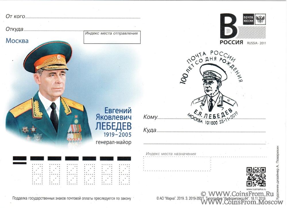 2019 г. Почтовая карточка"100 лет со дня рождения генерал-майора Войск РХБЗ Е.Я. Лебедева" Художник А. Поварихин. Типография "Информпресс-94".