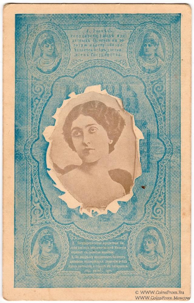 Открытка стилизована под 5 рублей 1898 г., с изображением девушки по центру (Лина Кавальери). Вариант 1: коричневый портрет. Открытое письмо. Всемирный Почтовый Союз России.
