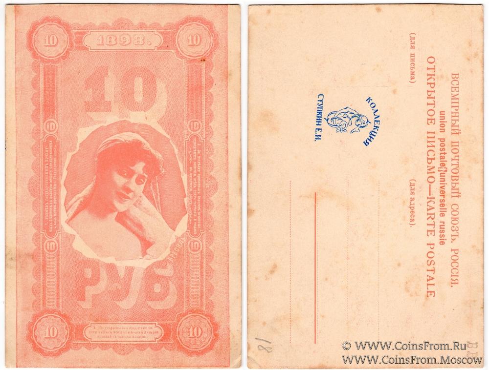 Открытка стилизована под 10 рублей 1898 г., с изображением девушки по центру (Лина Кавальери). Вариант 2: портрет вправо.