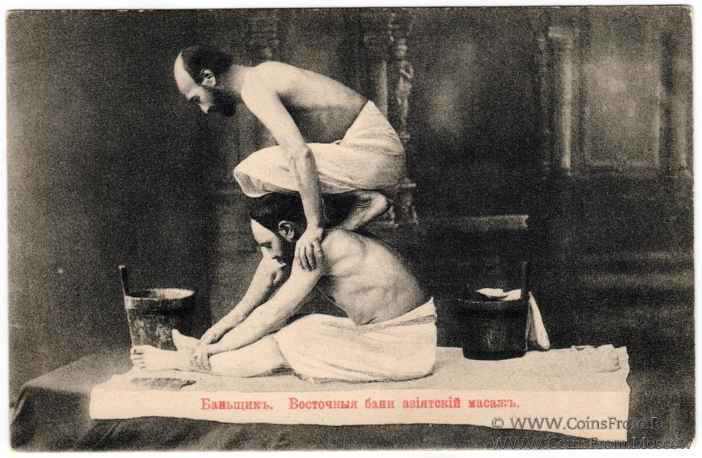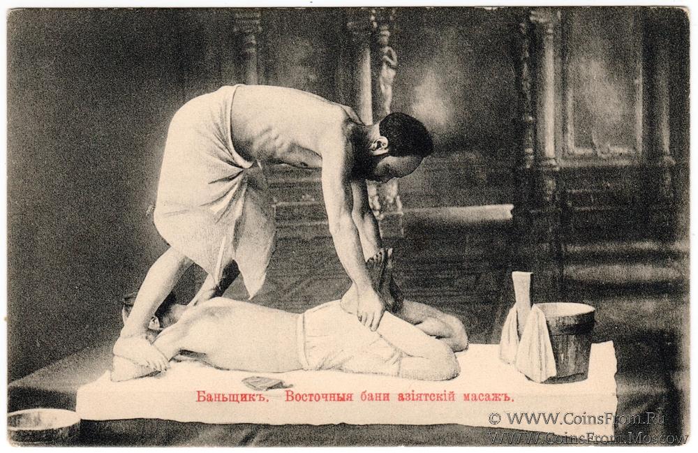 Открытое письмо (до 1918 г.). Два вида. Банщик. Восточные бани, азиатский массаж. ("Баньщикъ. Восточныя бани азiятскiй масажъ").