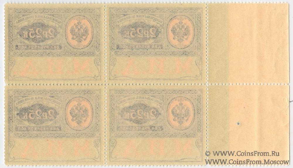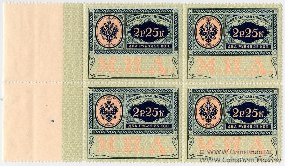 Марка консульской пошлины без даты (1913 г.). "М.И.Д.". Квартблок. Чистая с клеем без наклеек.
