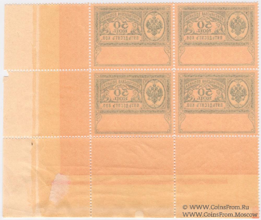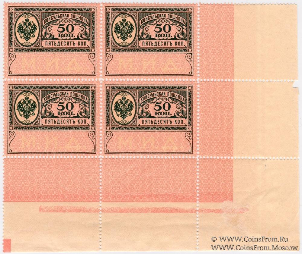 Марка консульской пошлины без даты (1913 г.). "М.И.Д.". Квартблок. Чистая с клеем без наклеек.