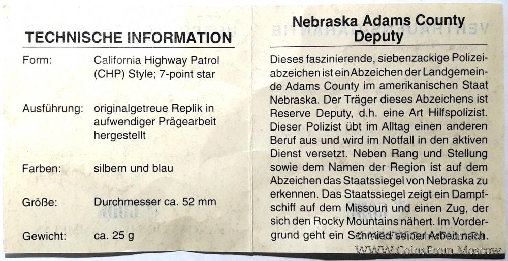 Жетон полиции. Штат Небраска. США. Коллекционная сертифицированная копия.