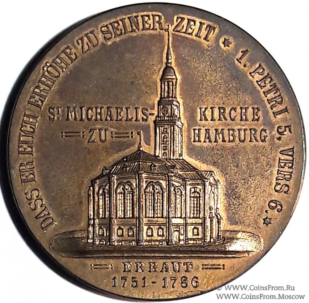 На медали изображен Собор Святого Михаила в Гамбурге, Германия, до и после пожара, который разрушил город.
