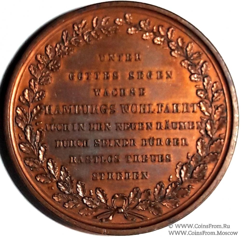 На медали символичное изображение города Гамбурга на фоне здания биржы.