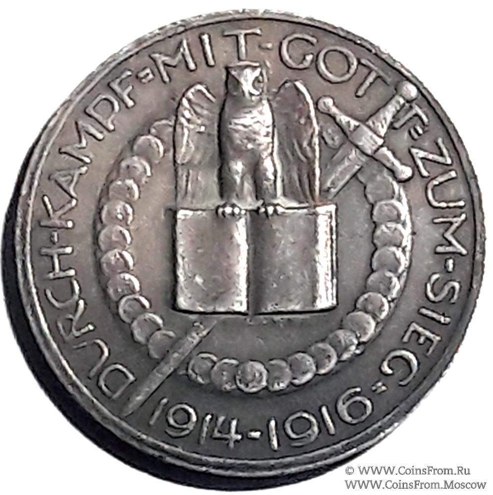 Реверс: надпись "DURCH KAMPF * MIT GOTT * ZUM SIEG * 1914-1916" (В БОРЬБЕ * С БОГОМ * К ПОБЕДЕ * 1914-1916).