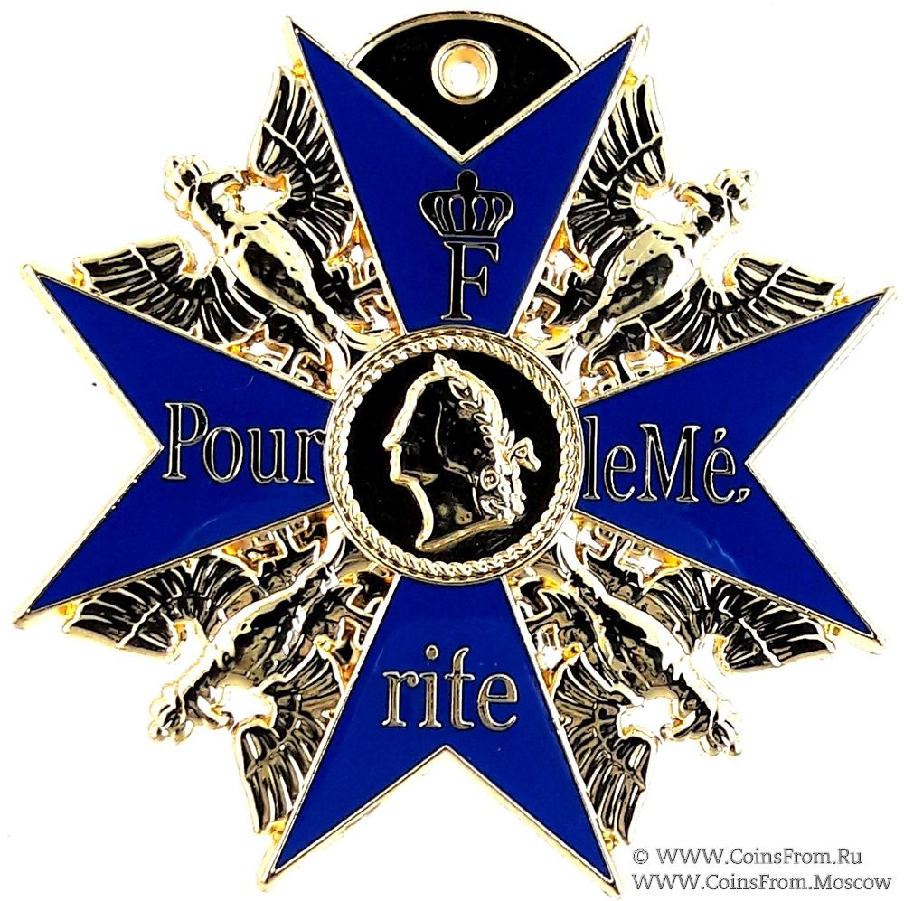 Награда была учреждена в 1740 году прусским королём Фридрихом Великим, который дал ему французское название, поскольку это был основной язык прусского двора того времени. Изначально «Pour le Mérite» награждались как за военные, так и гражданские заслуги, но в январе 1810 года Фридрих Вильгельм III постановил, что этот орден может вручаться только военным.