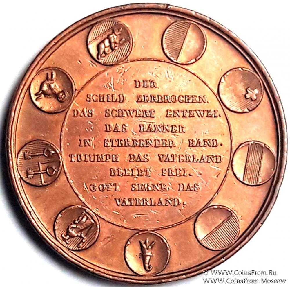 Надпись на обороте: "DER SCHILD ZERBROCHEN. DAS SCHWERT ENTZWEI. DAS BANNER IN STERBENDER HAND. TRIUMPH DAS WATERLAND BLEIBT FREI. GOTT SEGNE DAS VATERLAND."