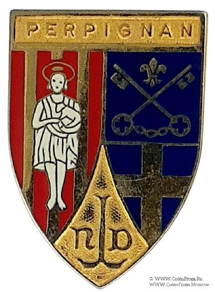 Значок города Перпинья́н (Франция Perpignan) — город, на реке Тет, административный центр департамента Пиренеи Восточные. Исторически являлся главным городом провинции Руссильон. Расположен в 13 км от берега Средиземного моря и в 31 км к северу от французско-испанской границы. Центр виноделия.