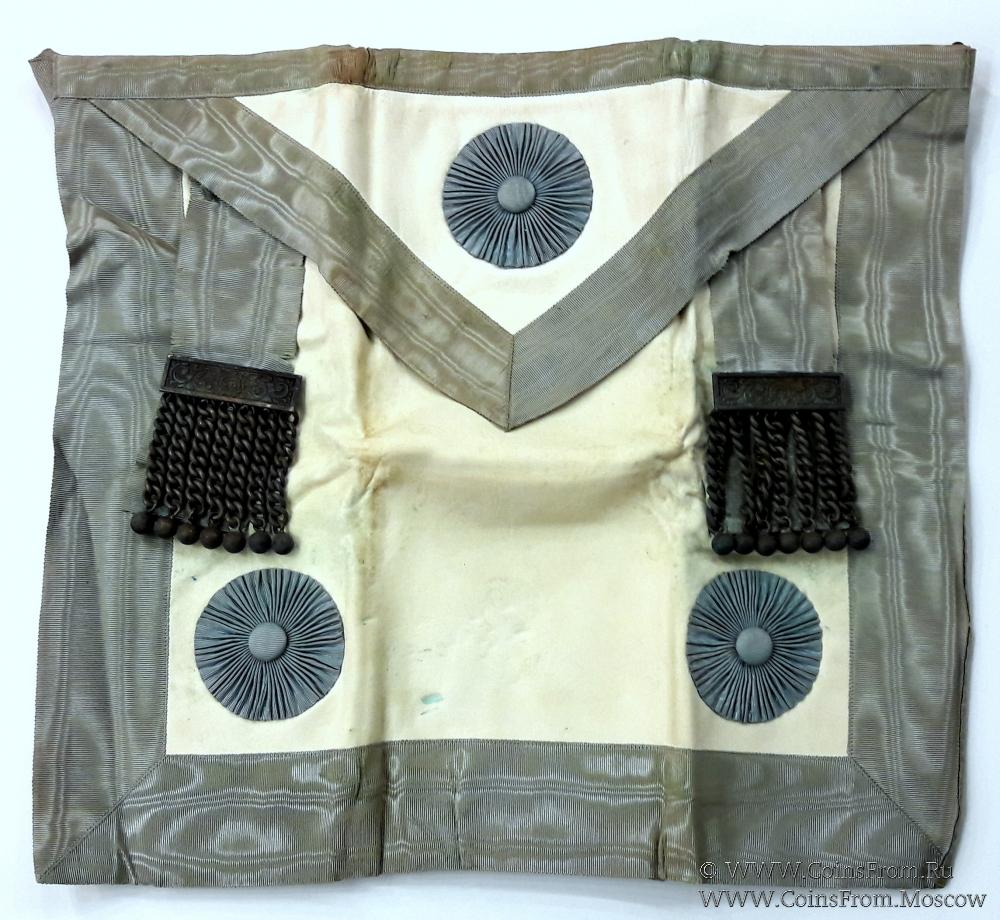 Запон из натуральной белой овчины-мерлушки подбит и оторочен голубым, ширина оторочки 50 мм (не превышает 2 дюймов).