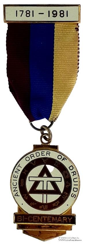 АВЕРС: круглой формы. Белый круг с наименованием Ордена Ancient Order of Druids. Красный круг с символами зодиака. В центре дельта и тау – символы Ордена Друидов. В нижней части надпись: Bi-Centenary (200 лет).