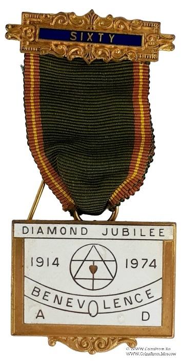 АВЕРС: прямоугольник белой эмали с символами Друидов в центре и датами 1914 - 1974. В верхней части надпись Diamond jubilee – бриллиантовый юбилей. Ниже надписи Benevolence аббревиатура ордена Друидов.