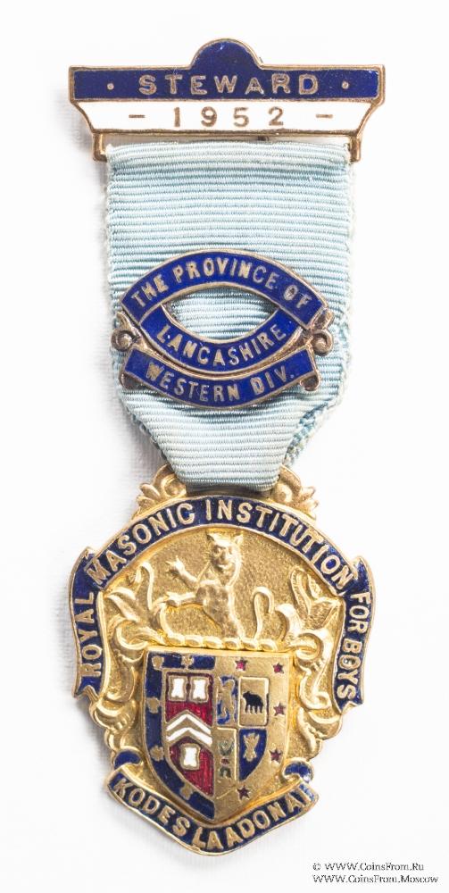 Краткое описание: Знак двухслойный. Основа в форме щита ограничена по кругу лентой синей эмали вверху с названием благотворительного института. В центре знака накладной малый герб Великой Ложи Англии в виде щита, ниже которого на ленте девиз: KODESLA ADONAI. На шите на бурлете размещён клейнод в виде восстающего стерегущего львиного леопарда (геральд). Клейнод и щит окружены намётом.