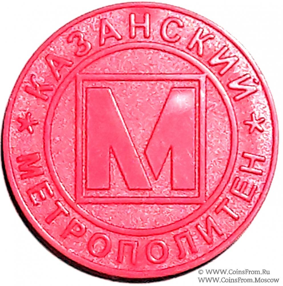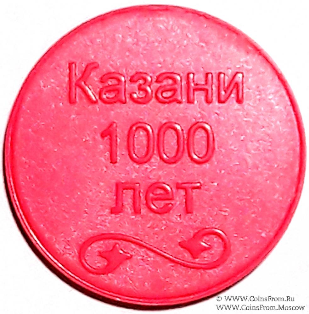 Пластиковый жетон красного цвета. Диаметр 30 мм. На одной стороне надпись "1000 лет Казани", на оборотной стороне — логотип предприятия "Метроэлектротранс".