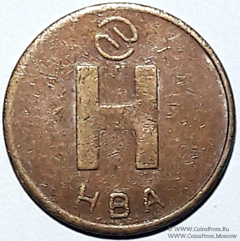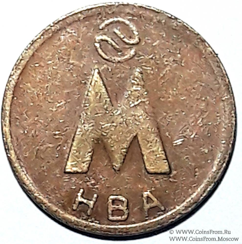 Металлический жетон медного цвета (сталь с медной плакировкой). Диаметр 24 мм. Изготовитель: "Новосибирский завод низковольтной аппаратуры" (НЗ НВА).