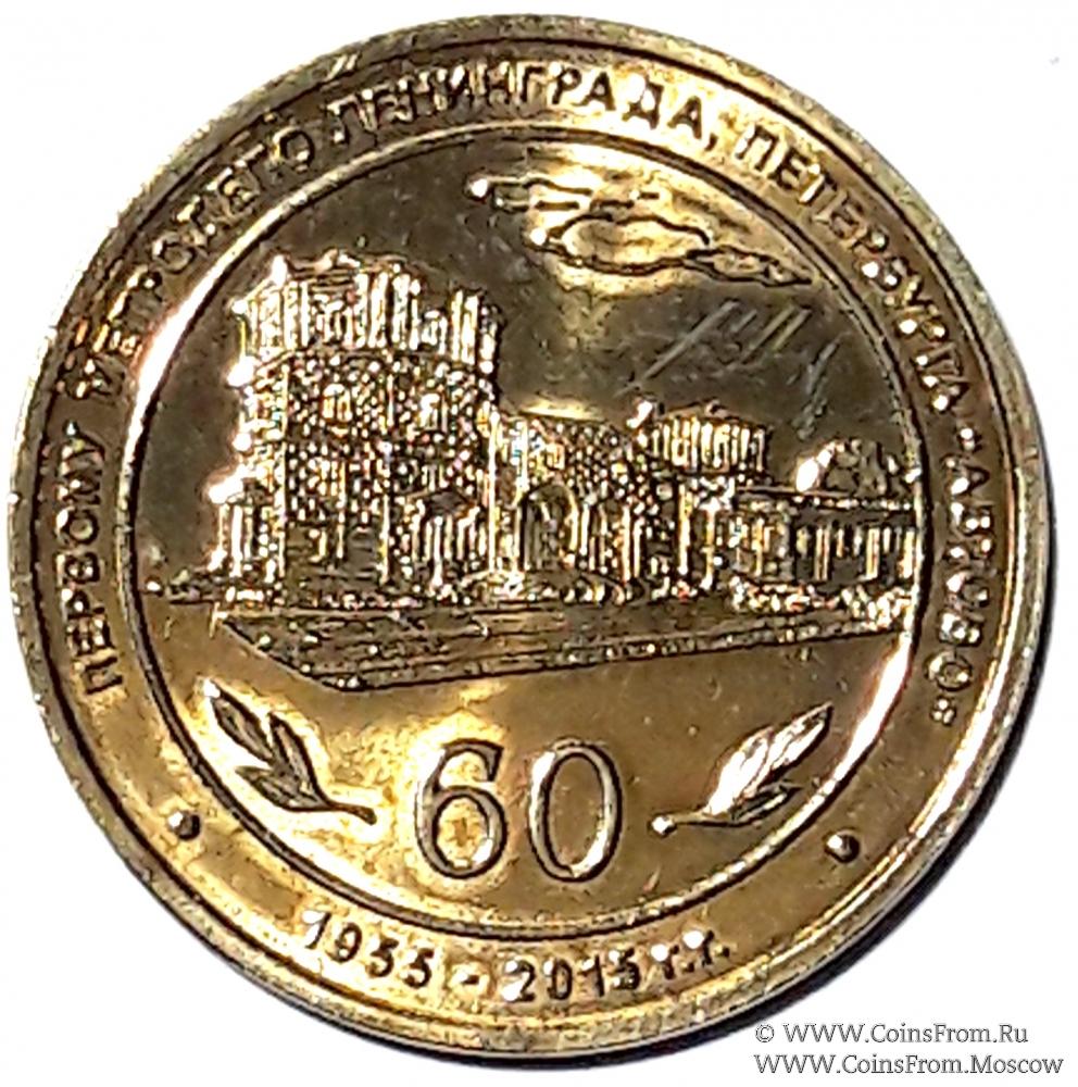 Юбилейный жетон, посвященный 60-летнему юбилею Петербургского Электродепо "Автово". Металл желтого цвета. Диаметр 23 мм. Без упаковки.