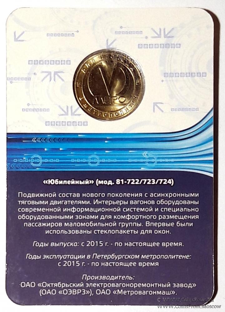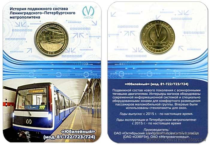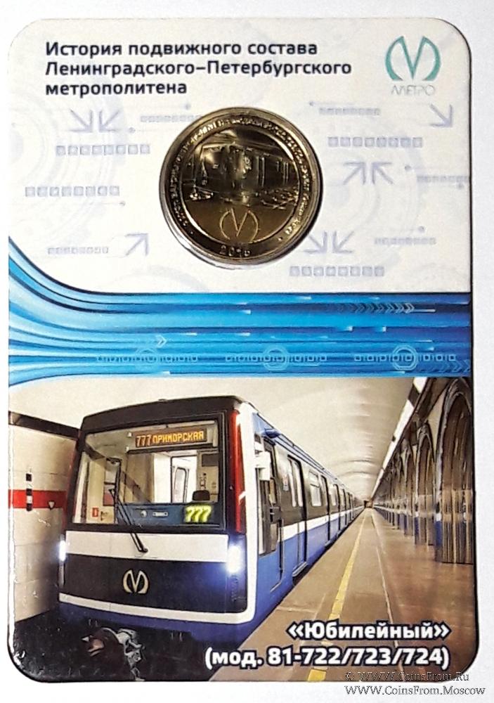 Юбилейный жетон серии "История подвижного состава Ленинградского-Петербургского метрополитена", на котором изображен вагон проекта "Юбилейный" (модель 81-722/723/724). Упаковка - блистер.