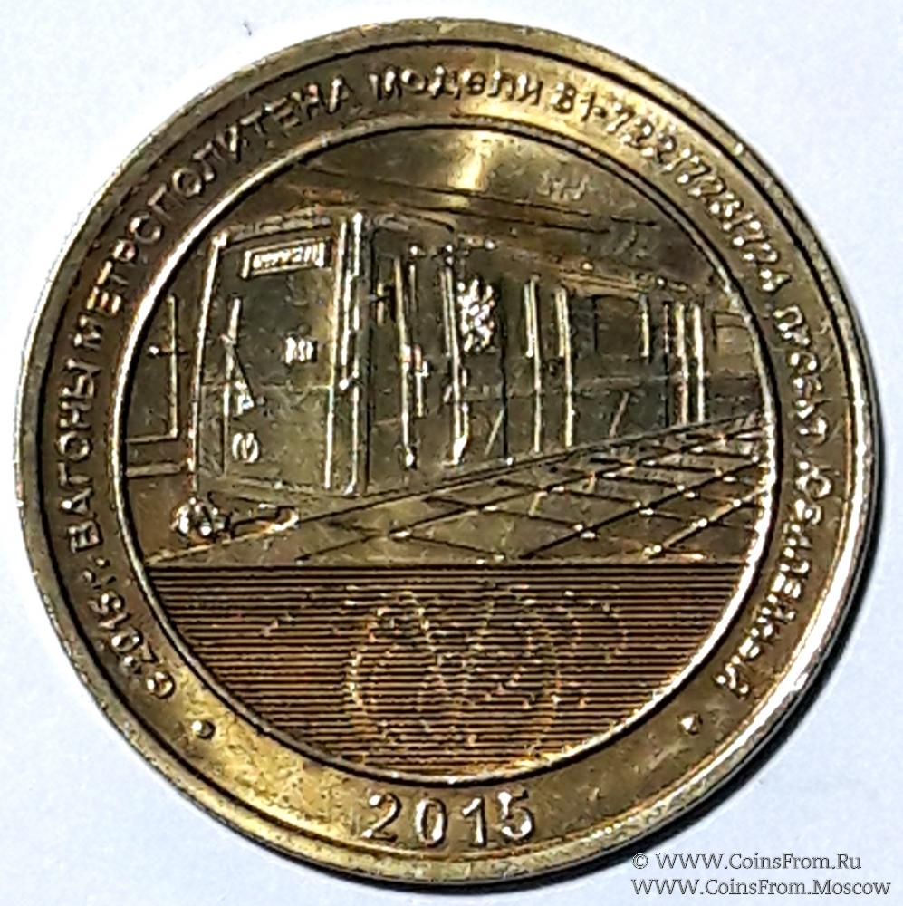 Юбилейный жетон серии "История подвижного состава Ленинградского-Петербургского метрополитена", на котором изображен вагон проекта "Юбилейный" (модель 81-722/723/724). Металл желтого цвета. Диаметр 23 мм. Без упаковки.