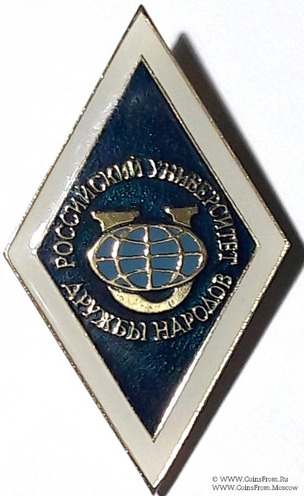 РОМБ РОССИЙСКИЙ УНИВЕРСИТЕТ ДРУЖБЫ НАРОДОВ посвящён одному из ведущих вузов страны и точно самому демократичному и дружелюбному — РУДН. Университет основан в 1960 году и до сих пор остаётся одним из самых популярных высших учебных заведений. На восьми факультетах обучаются студенты из более чем 150 стран. Вуз имеет филиалы в шести городах России. Знак изготовлен в виде ромба зелёного цвета с белой окантовкой. В центр помещена эмблема университета. По кругу выполнена надпись «РОССИЙСКИЙ УНИВЕРСИТЕТ ДРУЖБЫ НАРОДОВ».