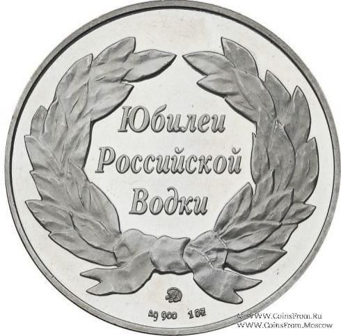 Настольная медаль «Юбилей российской водки. 1997 г.» Серебро, 34,79 гр. Диаметр 38 мм. Клейма на оборотной стороне: «Знак Московского монетного двора, обозначение металла и проба «Ag 900», вес «1 OZ». Состояние PROOF.