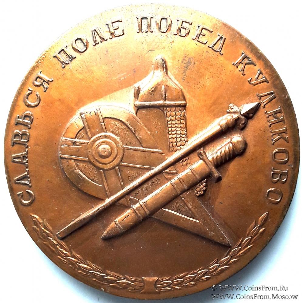 Памятная настольная медаль В честь 600-летия Куликовской битвы Белый тяжёлый металл. Бронзовый лак. Диаметр 80 мм. Толщина 6,5-8,5 мм.