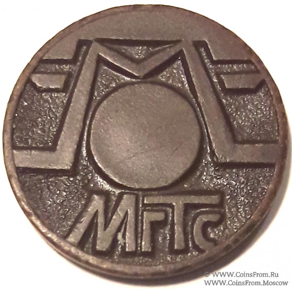 Телефонный жетон "Таксофон МГТС". Пластмасса коричневого цвета. Диаметр 20 мм. Таксофон - буквы большие. По каталогу № 351 (Сахаров В.Е.).