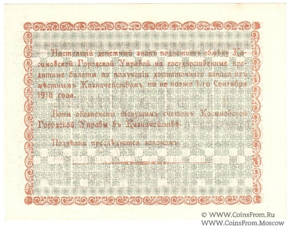 Временный разменный денежный знак 1918 г. (без даты). С элементами водяного знака. Касимовское городское и Земское самоуправление.