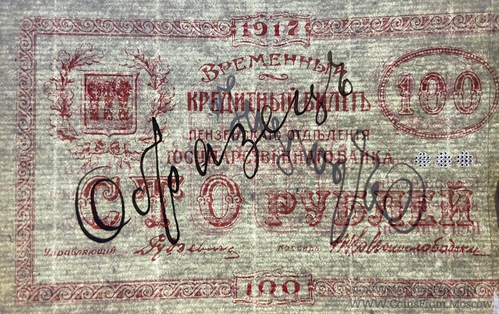 ОБРАЗЕЦ двусторонний: диагональная надпись чёрного цвета "Образецъ" на аверсе и реверсе. Перфорация (***). Бумага верже. Пензенское Отделение Государственного Банка.
