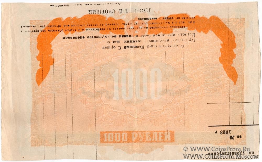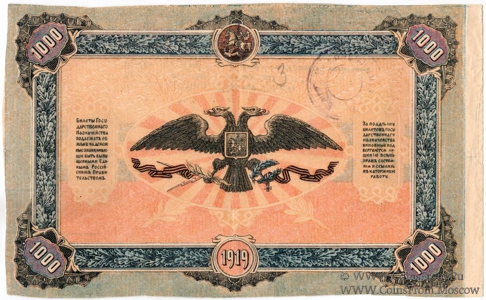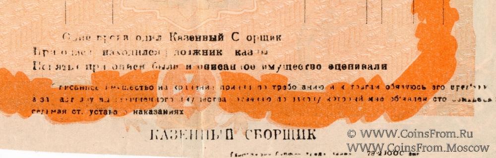 Билет Государственного Казначейства 1919 г. БРАК печати: недопечатка аверса (1 прогон краски), без номера. Вторичное использование: бланк Казённого Сборщика долгов 1923 г.