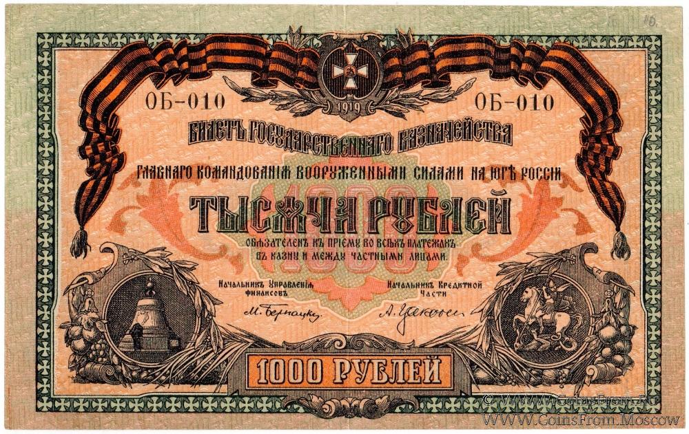 Билет Государственного Казначейства ГК ВСЮР 1919 г.