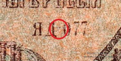 Билет Государственного Казначейства 1919 г. Водяной знак - мозайка. Литера - Я (Симферополь). БРАК: непропечатан дефис в номере справа.