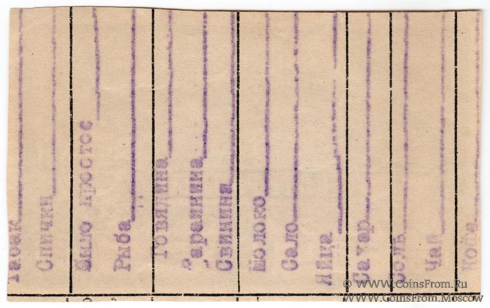 БРАК: только аверс. Вторичное использование: на реверсе напечатаны на печатной машинке список продовольственных товаров. Водяной знак - связанные звезды.