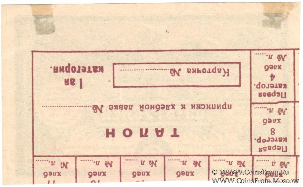 БРАК: Только аверс. Двойное использование: на реверсе напечатаны продовольственные талоны или карточки или их фрагменты. Водяной знак - связанные звезды.