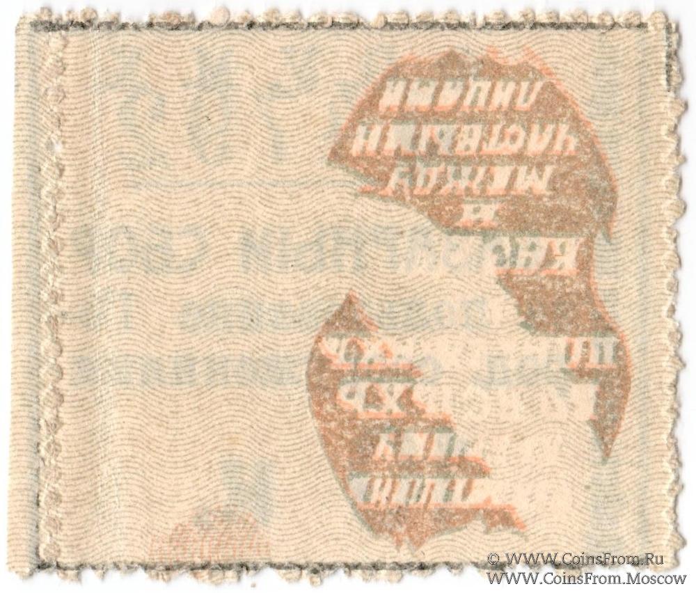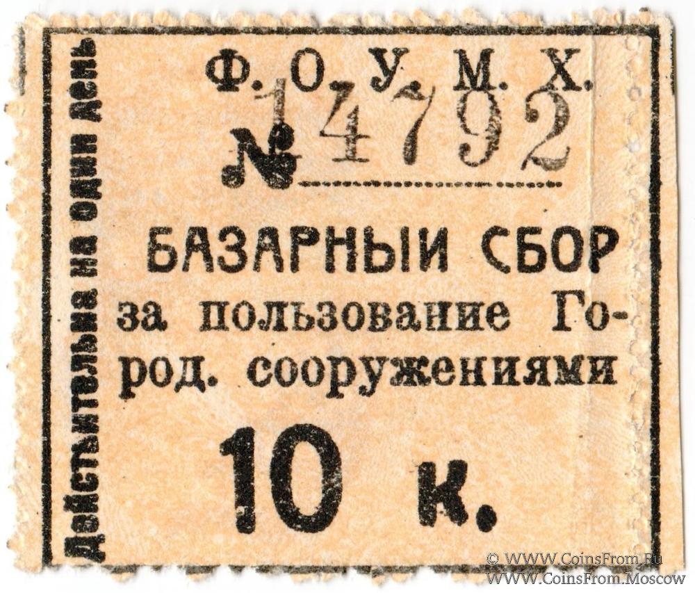 БРАК: фрагмент фона аверса и реверса. Вторичное использование: Феодосийское Общество Управления Муниципальным Хозяйством (Ф.О.У.М.Х.). 10 копеек Базарный сбор за пользование Городскими сооружениями.(г. Феодосия). Водяной знак - мозайка.