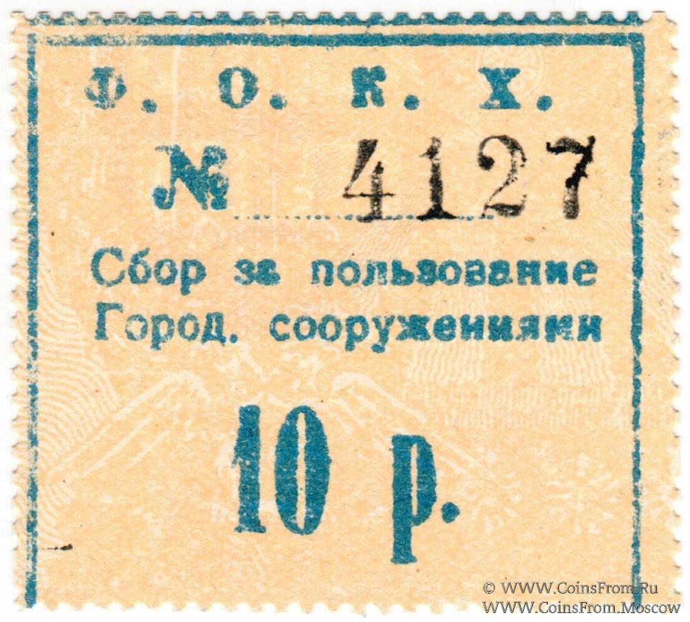 Вторичное использование: Феодосийское Общество Коммунального Хозяйства (Ф.О.К.Х.). 10 рублей. Сбор за пользование городскими сооружениями (г. Феодосия). Водяной знак - мозайка.