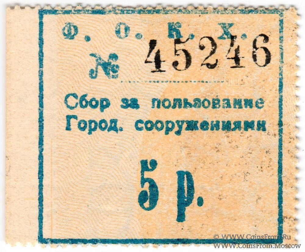 Вторичное использование: Феодосийское Общество Коммунального Хозяйства (Ф.О.К.Х.). 5 рублей. Сбор за пользование городскими сооружениями (г. Феодосия). Водяной знак - мозайка.