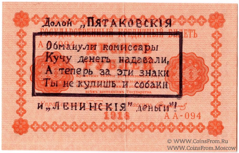 Надпечатка в рамке в четыре строки на государственном кредитном билете 10 рублей образца 1918 г. Шрифт надпечатки неровный (возможно штамп вырезан вручную).
