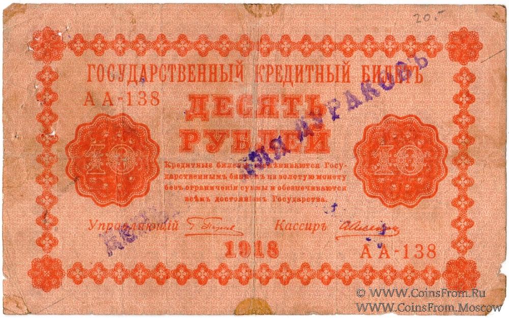Надпечатка в одну строку на государственном кредитном билете 10 рублей образца 1918 г. Шрифт фигурный.