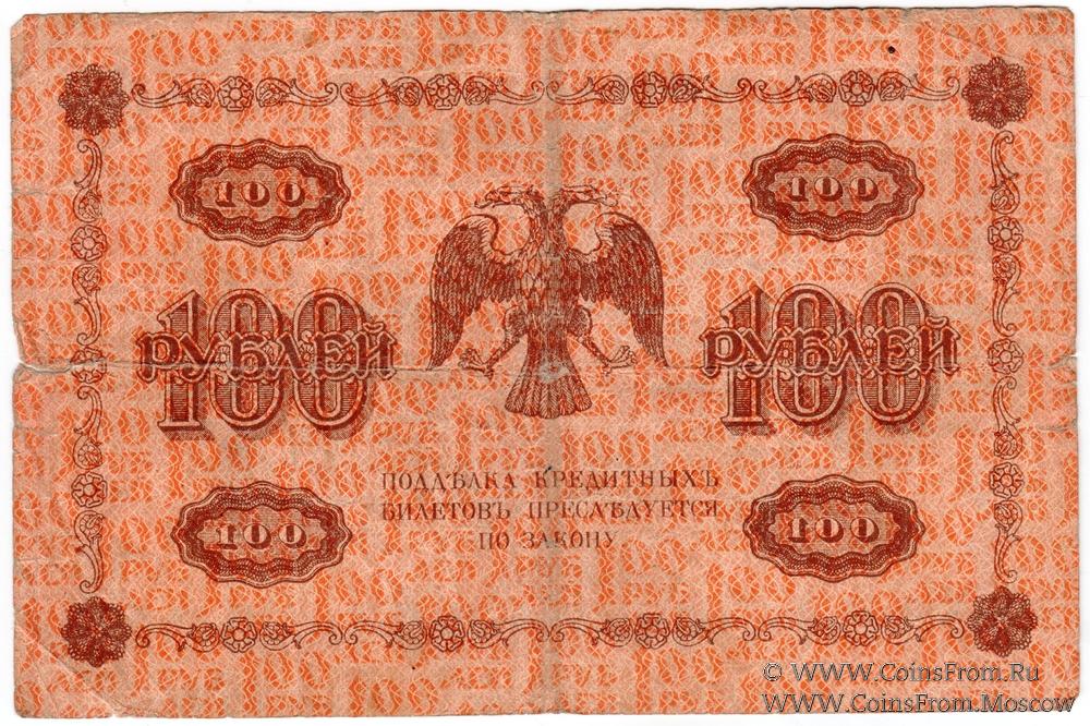 Надпечатка в четыре строки с рисунком и мелким текстом (неразборчиво) на государственном кредитном билете 100 рублей образца 1918 г. С ошибкой в тексте - "воЗсоздание".
