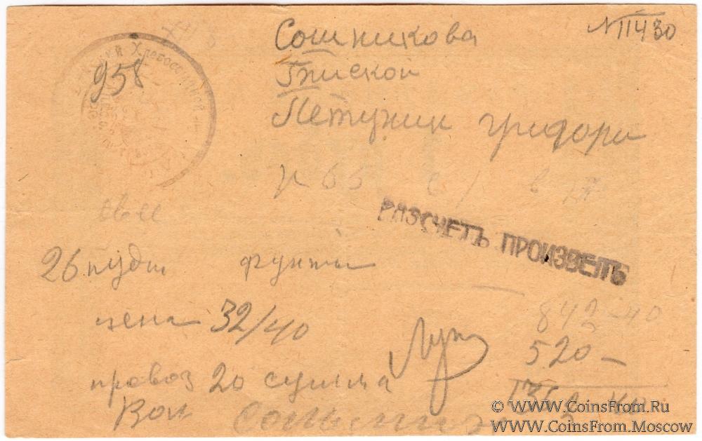 На реверсе печать П.К.С.С., рукописные заметки, номер (карандашом) и штамп "РАСЧЕТЪ ПРОИЗВЕЛЪ". Без перфорации. Бийский Кредитный союз.