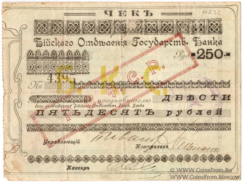 Чек. С наименованием банка. Первая буква "Р" в надпечатке "РСФСР" открытая. Бийское Отделение Государственного Банка.