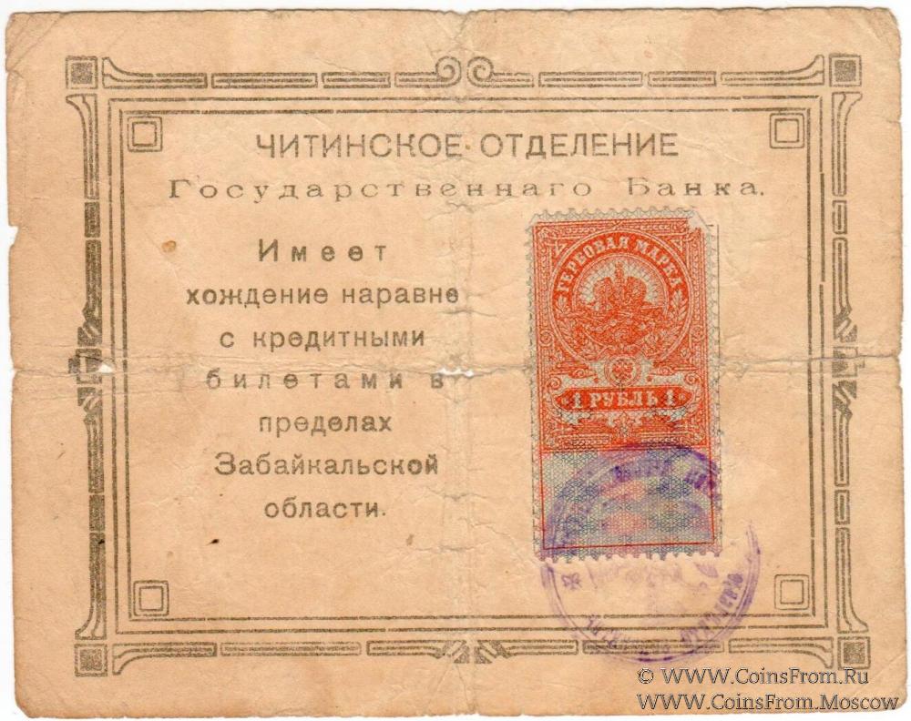 Гербовая марка 1 рубль, рамка украшенная. Читинское Отделение Государственного Банка.