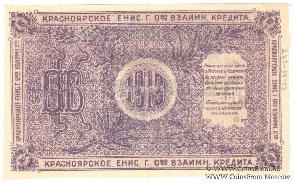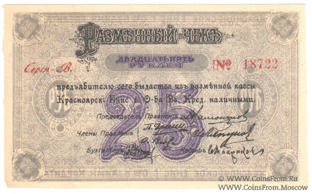 Серия В. Разменный чек 1919 г. 3-й выпуск. Красноярское Общество Взаимного Кредита.